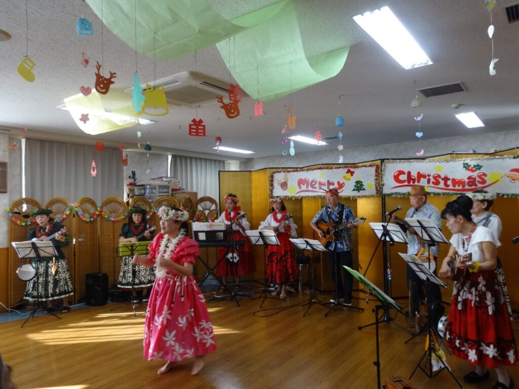 1組目は「ウクレレ同好会」の皆さんによる、演奏やフラダンスを披露していただきました。とても優しい楽器の音色や歌、華麗なダンスで癒される雰囲気が部屋中に広がっていました。患者さんも馴染みのある曲では、一緒に口ずさんだり手拍子をしながら笑顔で聴いている方がたくさんいました。